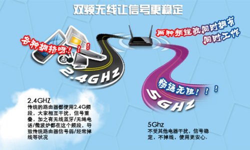 众所周知,家中常见的无线路由主要使用2.4GHz信号频段,但是在这个频段下工作的设备太多,比如大部分的无线路由、无线键鼠、无线音箱都在使用这个信号频段。它们相互之间会存在干扰,从而影响无线网络的使用。DIR-815的5GHz信号频段正好解决了这个问题,在同等条件下,5GHz频段干扰更少,无线速率更高,连接效果也更稳定,相当于为无线信号多设立了一条高速通道,而且这条通道是新建设的,没车没人,畅通无阻。用户最高可享受高达300Mbps的无线传输效能,效果已经完全超越了有线传输的100Mbps。