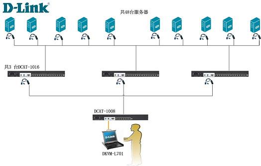 如下图所示,整个系统构件在D-Link旗下的企业级多计算机切换器系统三台DKVM-L701、DCAT-1008/16、DCAT-CP/CU基础上就可以完成。