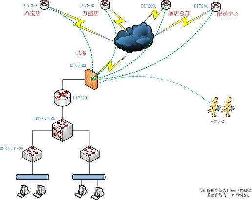 分部的DI 7200与总部的DFL1600建立多条VPN专用隧道,总部的DFL1600采用路由模式与核心DGS 3312SR连接,中间的DI 7500采用透明模式,主要对用户进行上网行为管理,DGS 3312SR配置了几个VLAN,并对此做了相应的策略(此为主要配置)。应用户要求完成任务后,深受用户赞赏,并提出如还有机会将继续采用D-Link的相关产品。