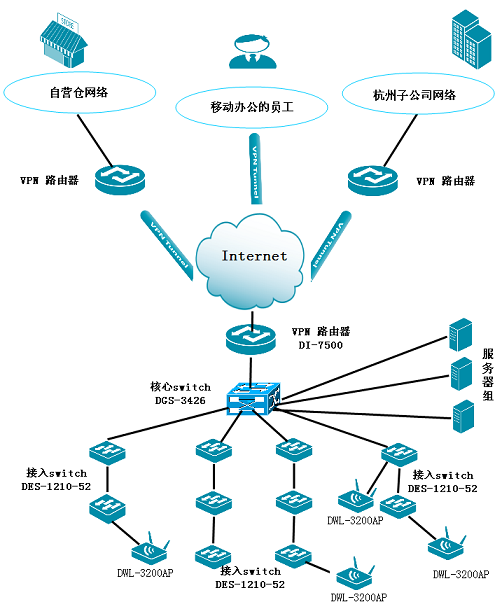 宝尊电商是电子商务性公司,对网络依赖度非常高,对于网络的可靠性、安全性有着非常高的要求。经过多家提供的网络整体解决方案,最终选择D-Link整体网络解决方案,并全部使用D-Link网络产品。根据客户要求极高的性价比产品,核心选择的是全1000M路由交换机DGS-3426,出口建议使用DFL-1660+DI-7500,主要是网络安全及上网行为管理。因客户节约成本考虑,先期只用DI-7500作为出口及上网行为管理的设备。接入层交换机全选用D-Link安全性能极佳的DES-1210-52交换机。无线覆盖并采用多SSID的方式,选用DWL-3200 AP,并要求无线用户数限制、隔离等安全功能。