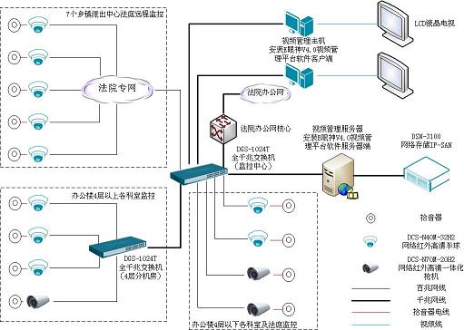 整套方案主要实现了对前端网络音视频的集中管理、转发和存储。根据用户的需要选择了最具性价比的高清红外半球和高清红外一体化枪机,完全能满足24小时音视频不间断采集的需要,同时实现了法院主要领导可以通过内部办公网络对各个审判庭、法庭前端音视频进行实时的监听、监看。