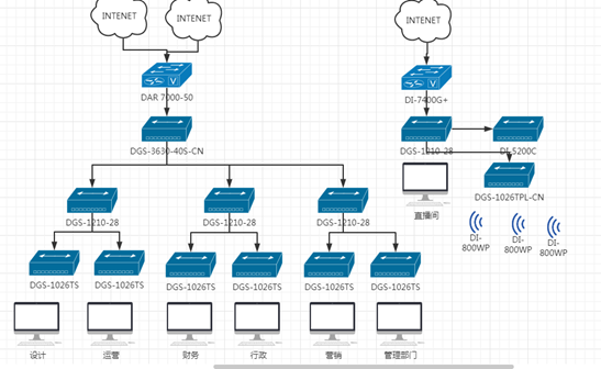 有线网络采用三层架构,千兆到桌面,并采用DAR-7000系列审计网关作为出口网关,提供专业级应用层流量控制和准入管控,保证网络应用的可靠和安全。